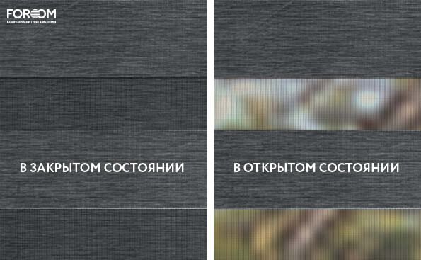 Каждый слой ткани имеет чередующиеся непрозрачные и прозрачные полосы. При смещении полос друг относительно друга можно добиться полного затемнения («ночь», когда непрозрачные полосы совпадают), максимального светопропускания («день», когда совпадают прозрачные полосы) или промежуточных режимов, создавая эффект «зебра».