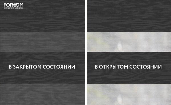 Полотно ткани, состоит из чередующихся горизонтальных полос – прозрачных и непрозрачных. Изменяя положение этих полос относительно друг другу, можно создать целых 3 режима регулировки светом. Например, чтобы в помещении стало светлее, нужно расположить прозрачные полосы друг напротив друга. Если разместить прозрачную и непрозрачную полосу параллельно друг другу, то можно добиться практически полного затемнения.